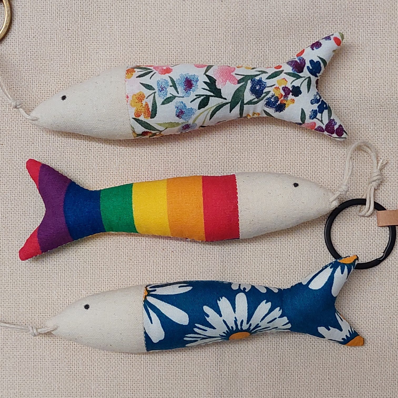 Cada sardinha é feita à mão com combinações de tecidos coloridos e padrões únicos, o que garante que nenhuma é exatamente igual à outra. Pode ser usada como porta-chaves, pendurada numa mochila ou até como pequeno elemento decorativo.