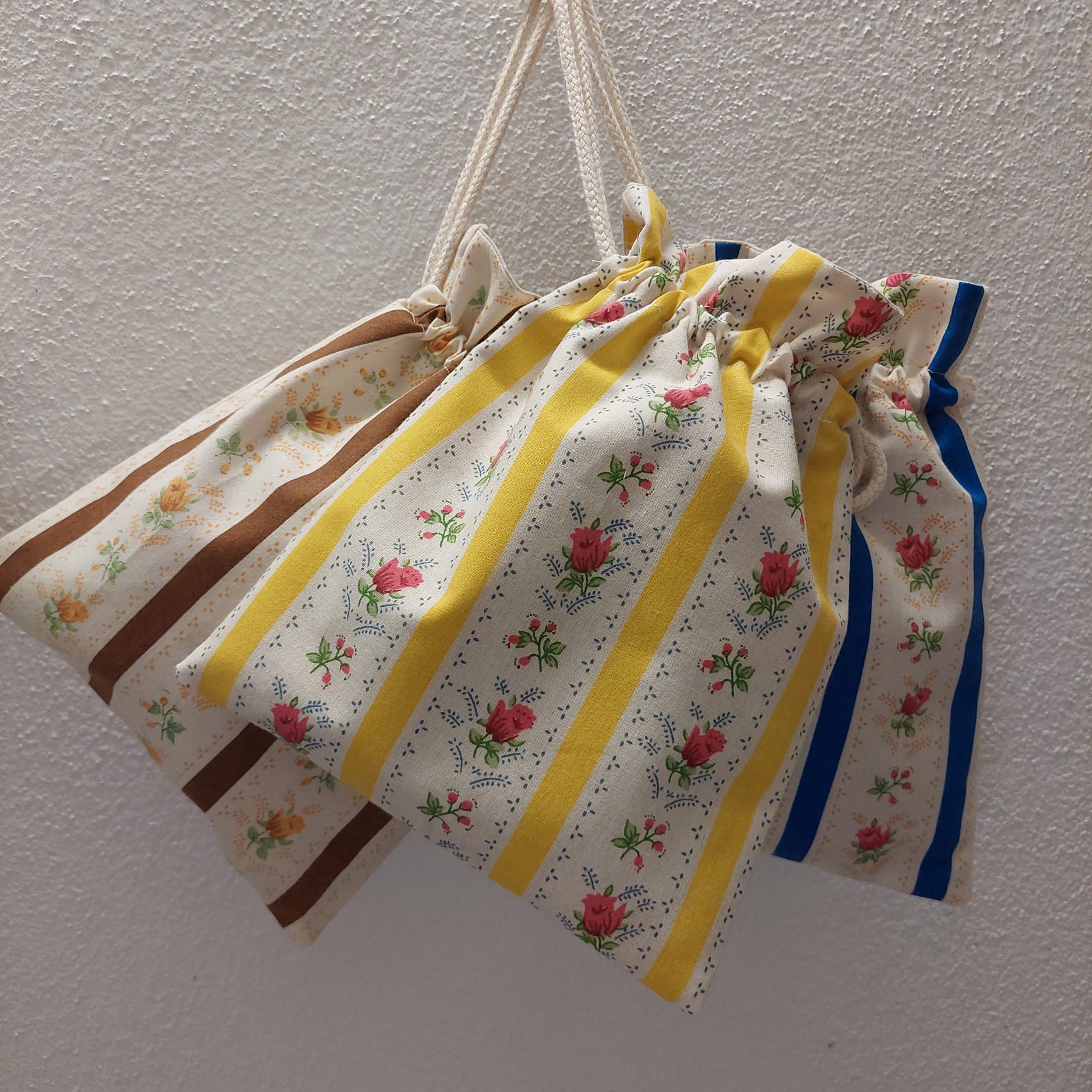 O talego é criado com tecidos algodão resistente, com forro e cordões do mesmo material para um toque natural e duradouro. Cada peça tem um padrão floral alegre e colorido.